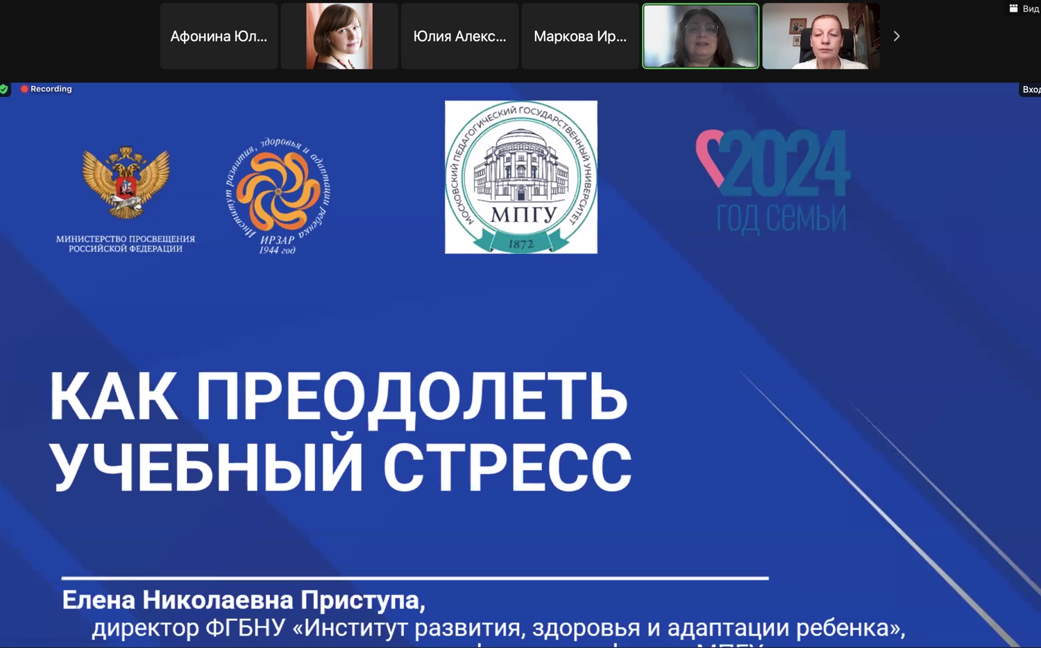 Елена Николаевна Приступа, директор ФГБНУ «ИРЗАР», доктор педагогических наук, профессор провела лекцию о преодолении учебного стресса в рамках проекта «Ученик, учитель, родители: сотрудничество в образовании». Лекция проходила в дистанционном формате и была предназначена для преподавателей и учителей.