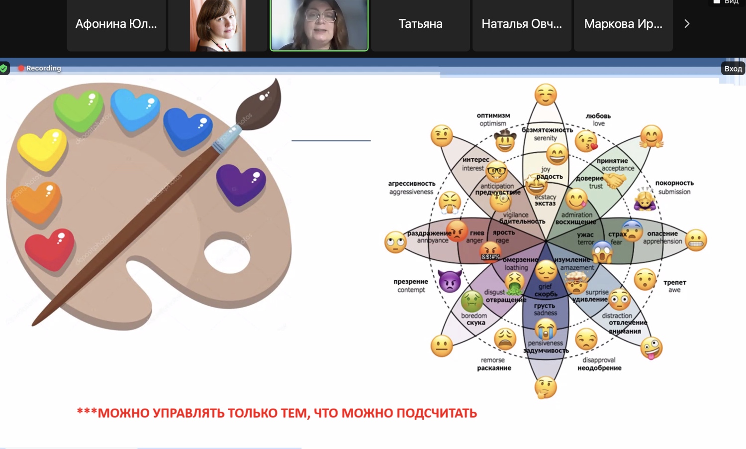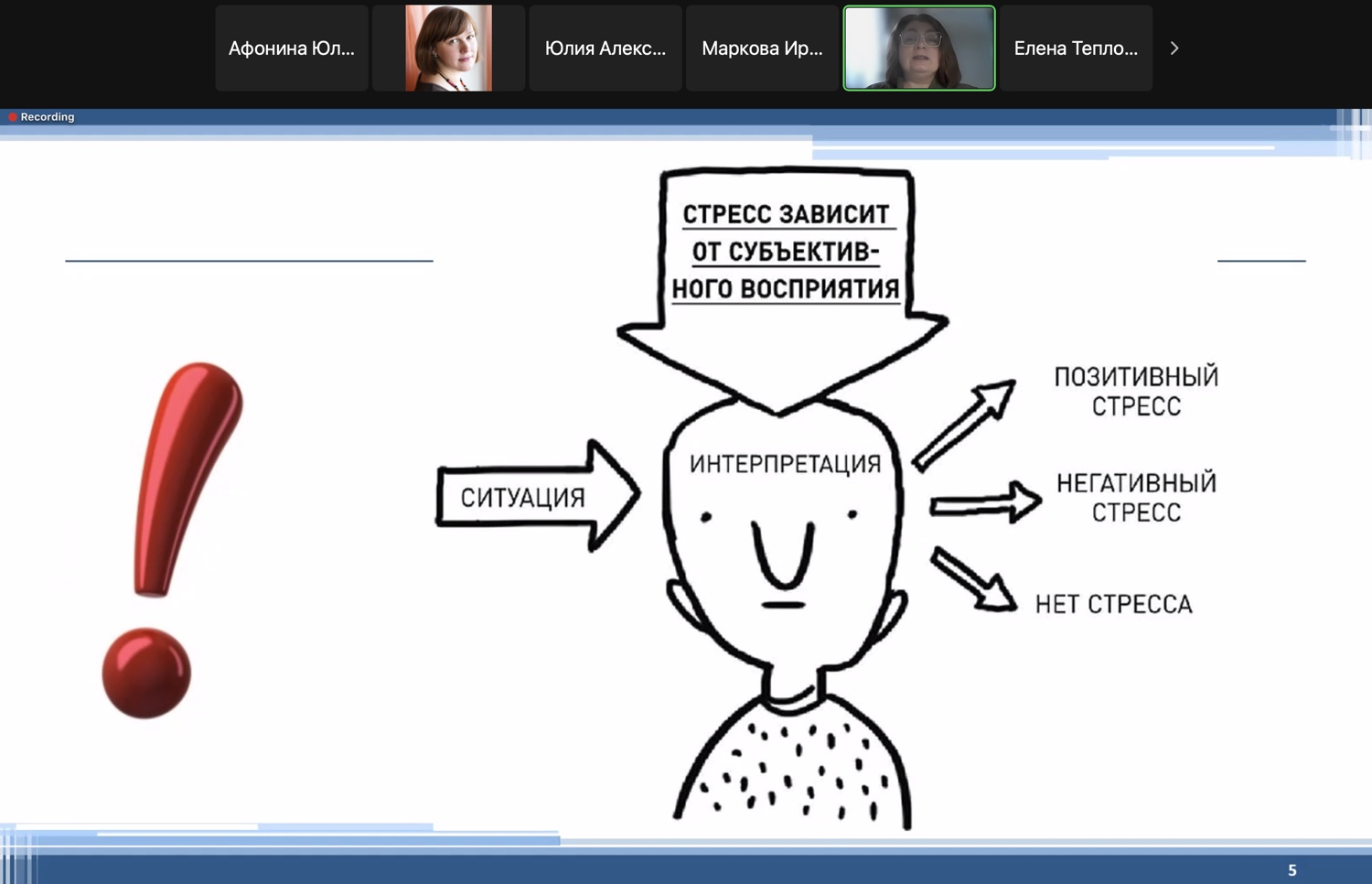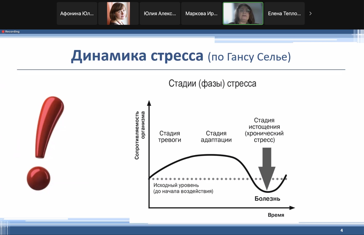 В ходе своего выступления Елена Николаевна затронула проблему учебных неврозов обучающихся и предложила ряд рекомендаций по их предотвращению и решению. Она поделилась информацией о помощи обучающимся при стрессе и тревоге, рассмотрела динамику стресса по Гансу Селье, где выделила стадии (фазы) стресса, обсудила причины стресса и формы работы над стрессом. Также были затронуты темы эмоционального интеллекта, психологического портрета эмоционально устойчивого человека и эмоциональной гигиены.