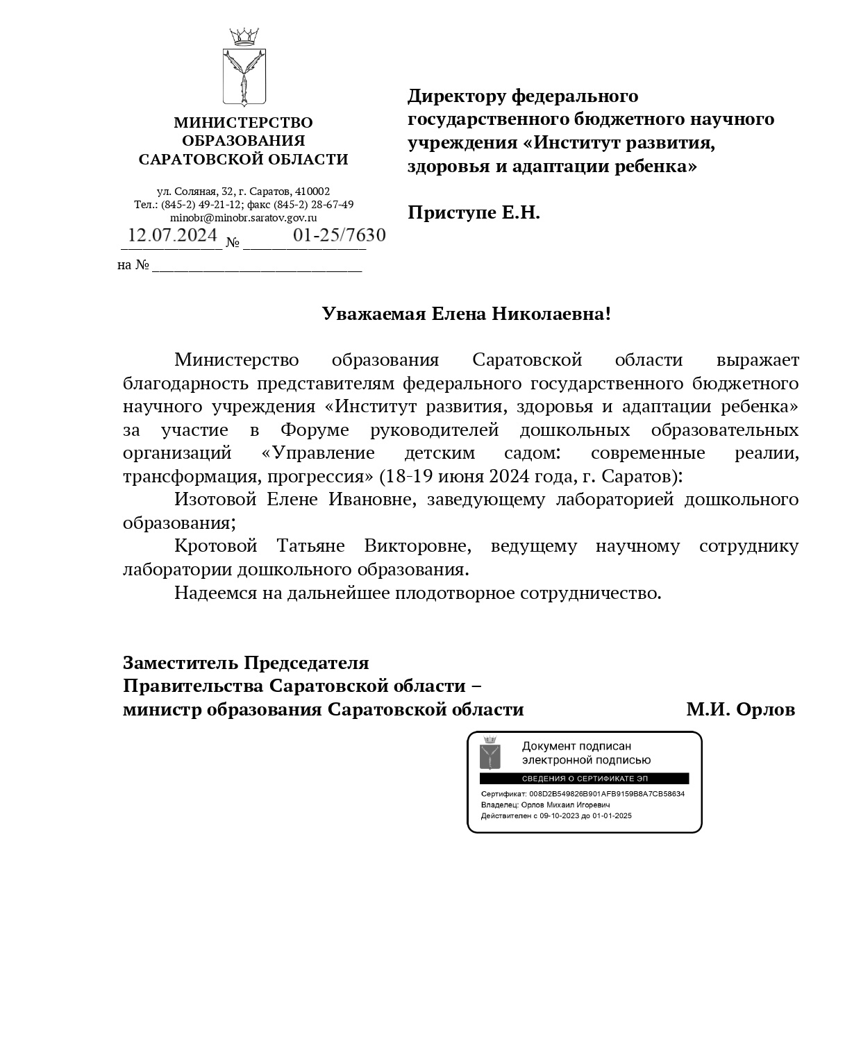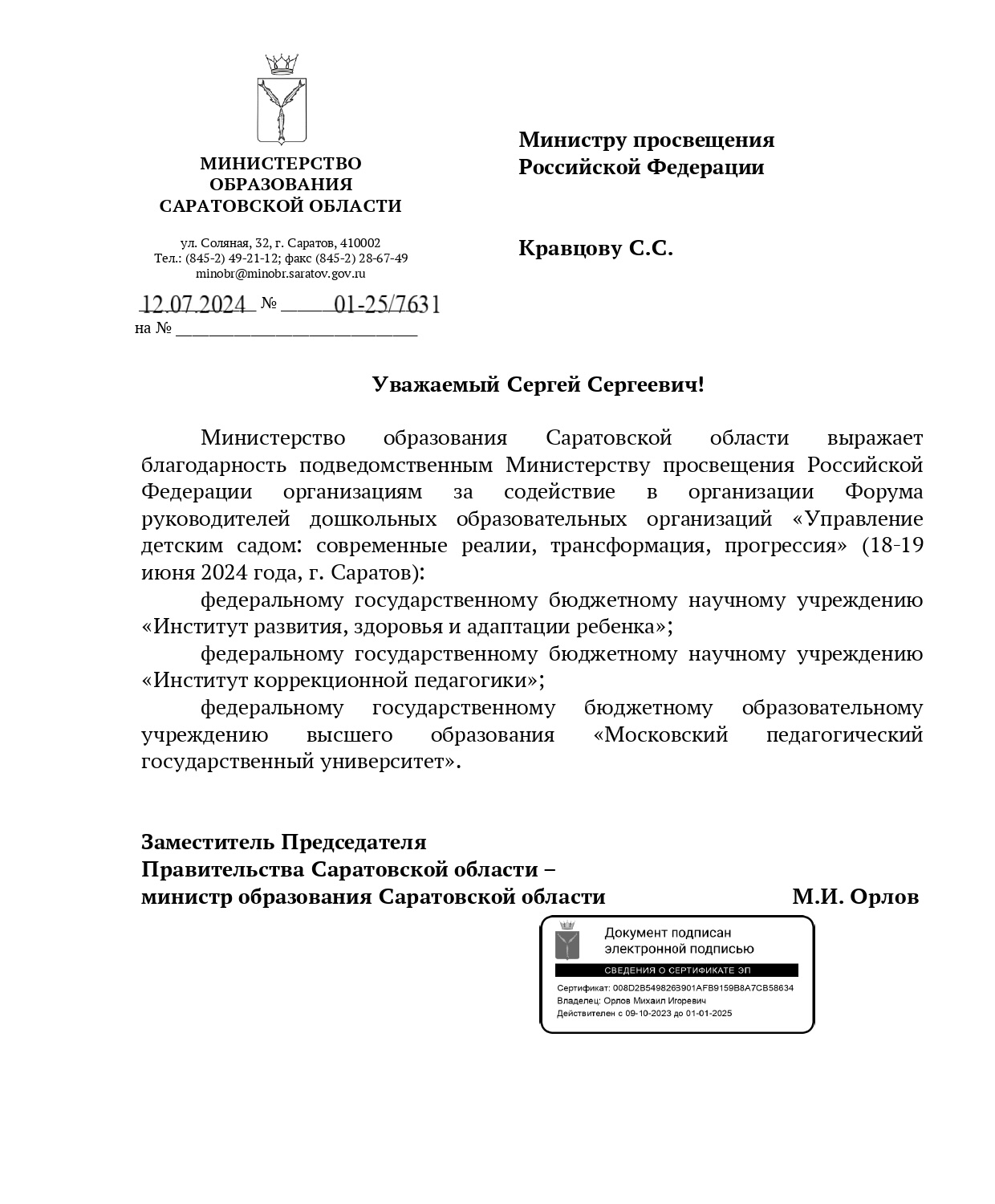 Министерство образования Саратовской области, в лице заместителя Председателя Правительства Саратовской области – министра образования Саратовской области Михаила Игоревича Орлова, выразило благодарность ФГБНУ «Институт развития, здоровья и адаптации ребенка» за содействие в организации Форума руководителей дошкольных образовательных организаций «Управление детским садом: современные реалии, трансформация, прогрессия», который прошел в г. Саратове 18-19 июня 2024 года.