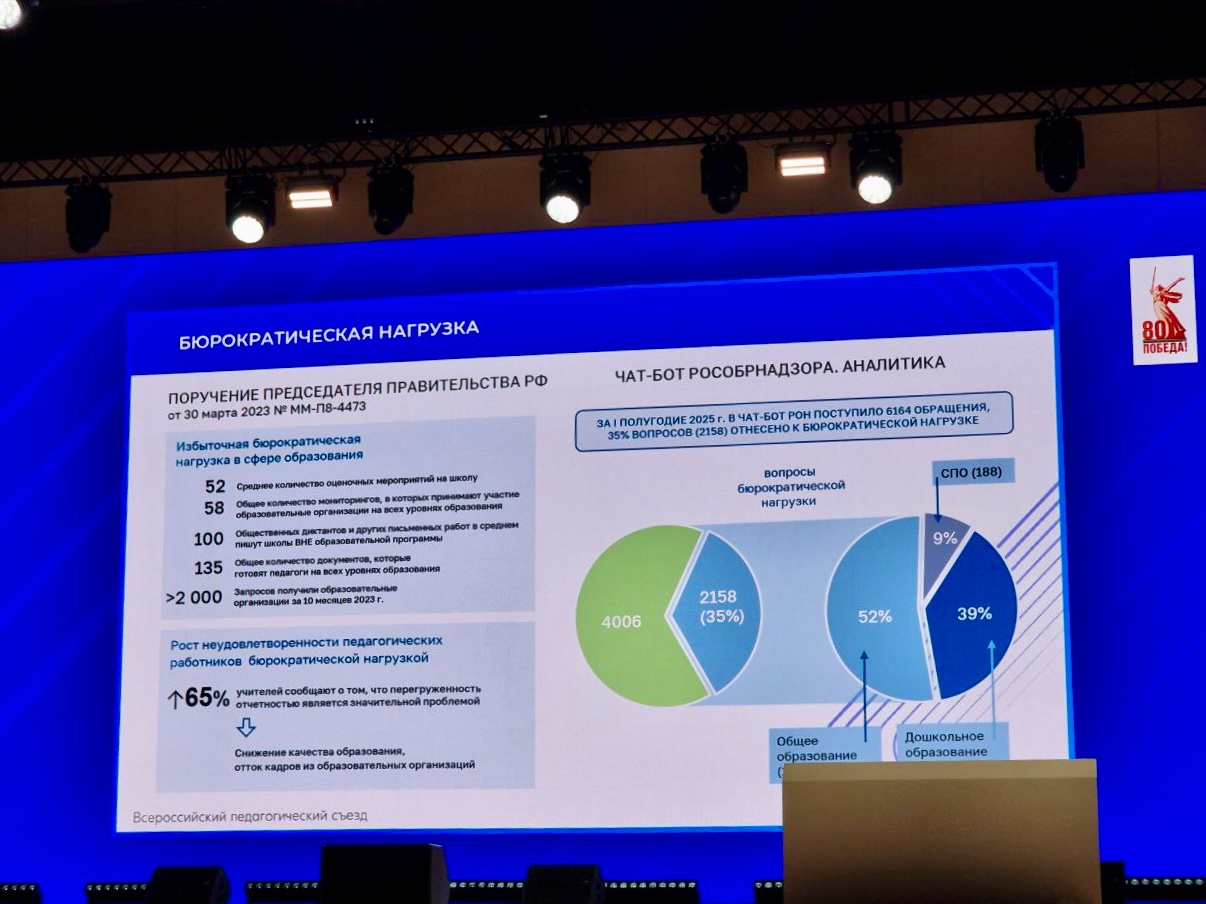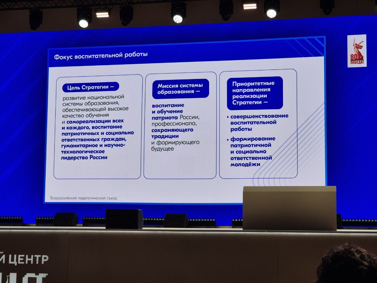 Особое внимание на съезде было уделено воспитанию, патриотизму, цифровизации, единой системе учебников и подготовке кадров будущего. По данным опросов, индекс гордости за страну у школьников вырос в 2,6 раза, а желание уехать за границу — снизилось с 23% до 7%.
