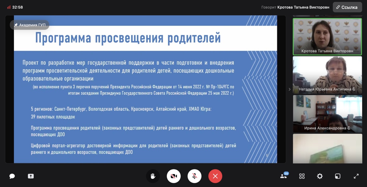 Ведущий научный сотрудник лаборатории дошкольного образования ФГБНУ «Институт развития, здоровья и адаптации ребенка» Кротова Татьяна Викторовна 04 апреля 2024 г. провела вебинар на тему «Обеспечение реализации просветительского направления деятельности педагогического коллектива ДОО» в рамках реализации Федеральной дополнительной образовательной программы «Школа управленца: управление дошкольной образовательной организацией» Государственного университета просвещения.