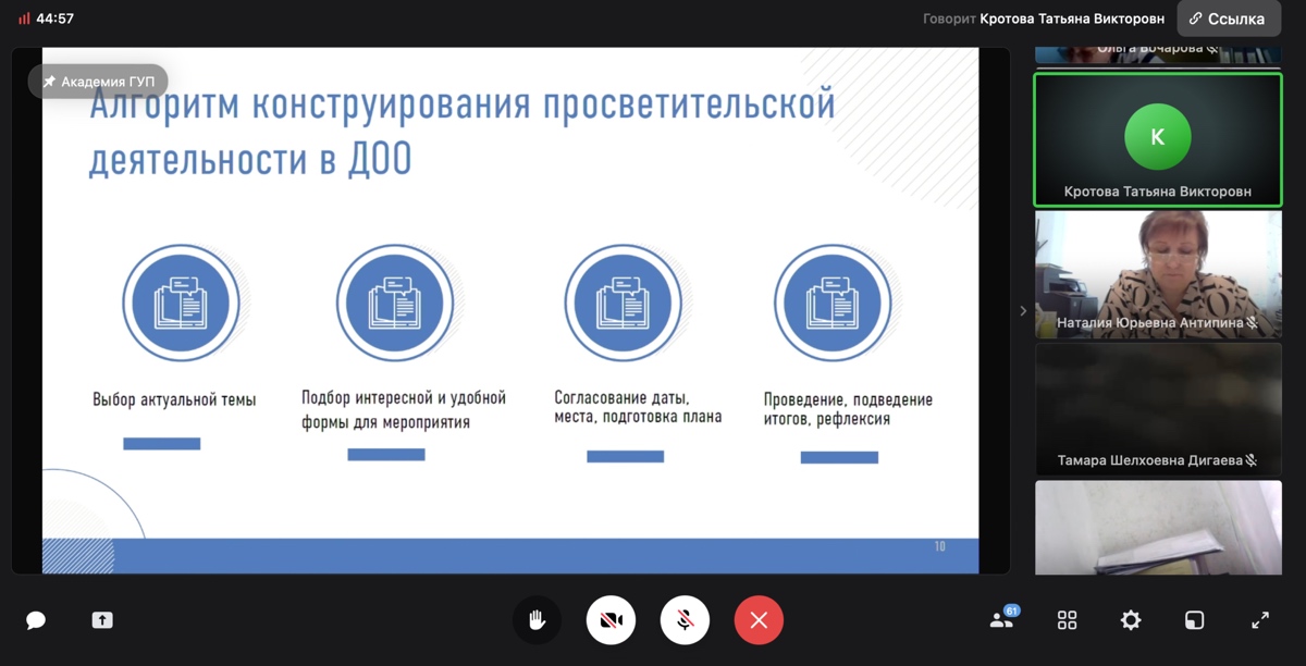 Также на вебинаре были освещены вопросы организации и управления процессом просвещения родителей (законных представителей) в дошкольной образовательной организации, выделены такие важные условия как мотивация сторон на целенаправленное и плодотворное общения, высокий уровень коммуникативной и цифровой компетентности современного педагога, рассмотрены вопросы внедрения программы просвещения в ДОО, представлен алгоритм осуществления просветительской деятельности педагогами дошкольных образовательных организаций.
